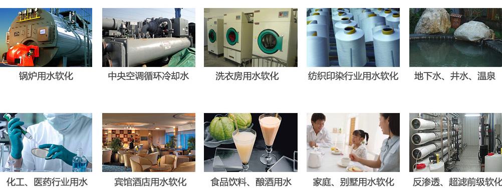 目前已广泛应用于各种蒸汽锅炉、热水锅炉、热交换器、蒸汽冷凝器、空调、直燃机等设备及系统的循环补给水中。此外还用作生活水处理,食品、电镀、医药、化工、印染、纺织、电子等工业水处理以及作为脱盐系统的前置处理,经过单级或多级软水器处理后的产水硬度可大幅度降低。